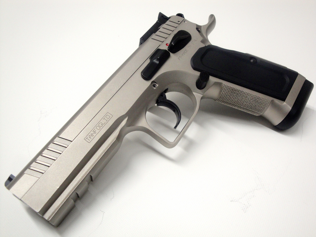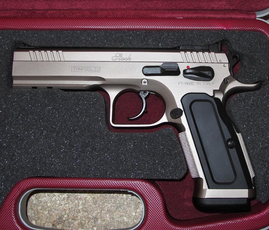 Pistola semiautomatica Tanfoglio Stck III Specila cal. 9X21, in doppia azione adatta per le gare di Tiro Dinamico - Classe Production - con: canna cilindrica, carrello in acciaio con ampie zigirinature per un facile azionamento, fusto integrale fino alla volta dell'otturatore con attacco rail per il posizionamento di torcia/puntatore laser. Il Gancio caricatore è custom, la sicura ambidestra, in ques'edizione speciale il modello Stock III ha finitura nichelata, guance e pad in alluminio neri. Nella dotazione di serie vengono forniti un caricatore di scorta e il set per la pulizia e Valigetta