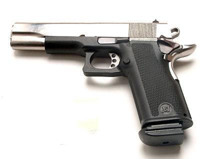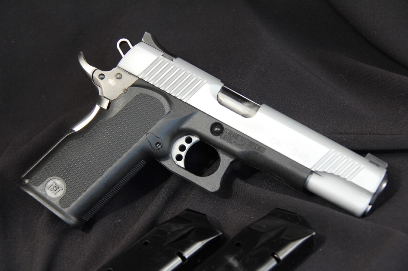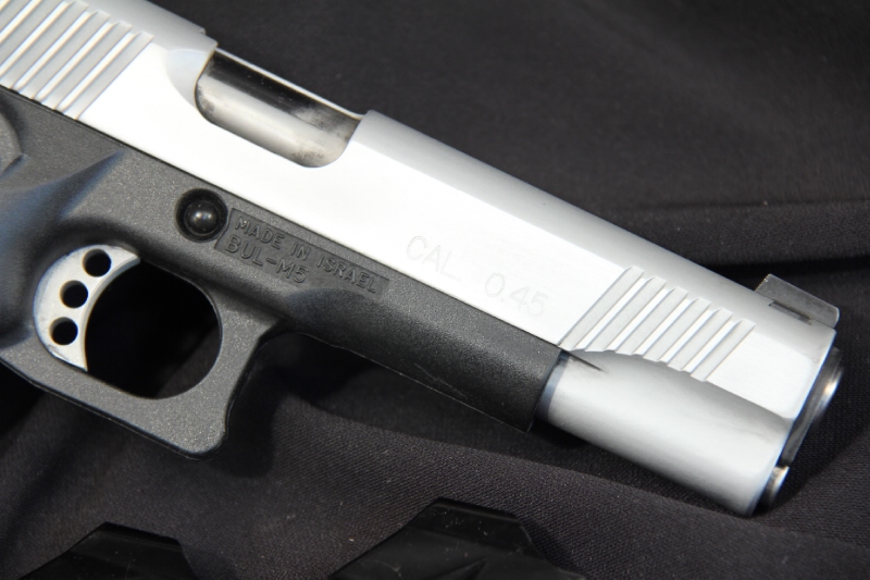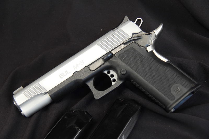 BUL M-5 GOVERNAMENT cal. 40 sw, canna 5 Pollici (128 mm),Fusto in tecnopolimero Black GreatGrip. Canna e carrello in acciaio. Finitura carrello Inox. Caricatore bifilare 17+1, tacche di mira regolabile, sicura destra e sistema all'impugnatura, singola azione. Peso complessivo 864g.