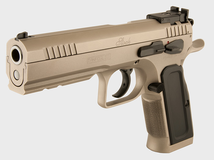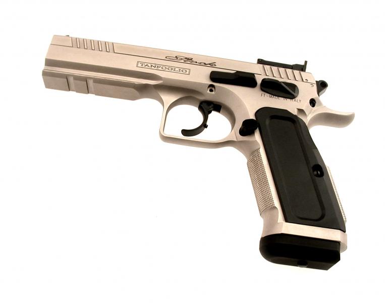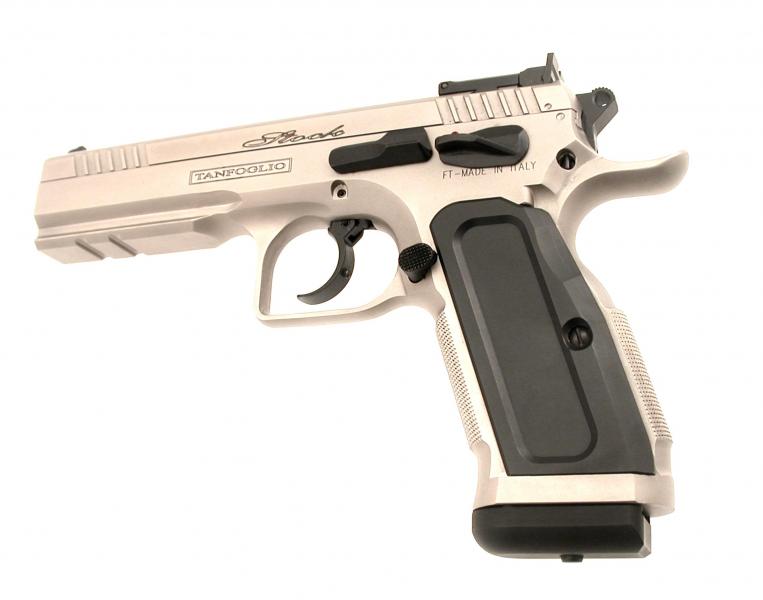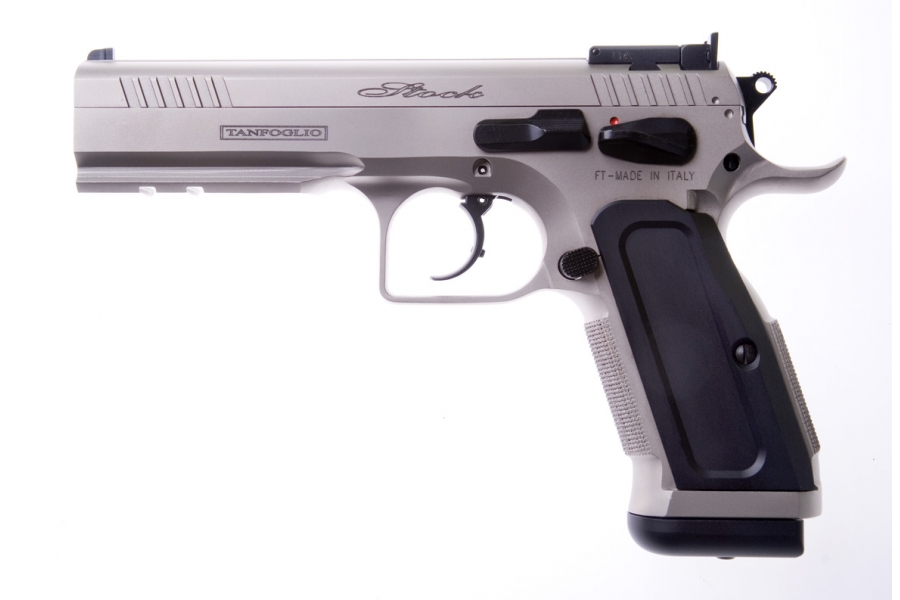 Pistola semiautomatica Tanfoglio Stck III Specila cal. 9X21, in doppia azione adatta per le gare di Tiro Dinamico - Classe Production - con: canna cilindrica, carrello in acciaio con ampie zigirinature per un facile azionamento, fusto integrale fino alla volta dell'otturatore con attacco rail per il posizionamento di torcia/puntatore laser. Il Gancio caricatore è custom, la sicura ambidestra, in ques'edizione speciale il modello Stock III ha finitura nichelata, guance e pad in alluminio neri. Nella dotazione di serie vengono forniti un caricatore di scorta e il set per la pulizia e Valigetta