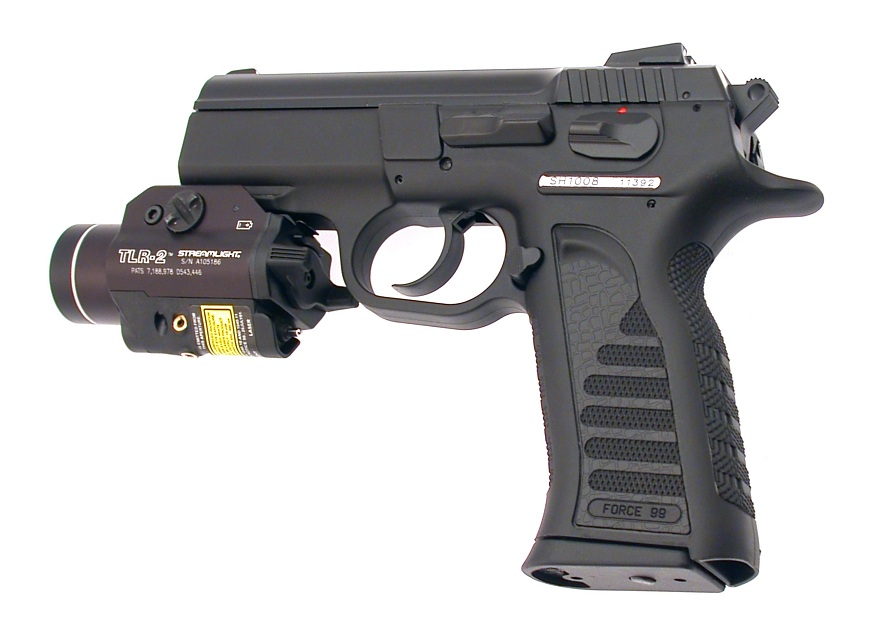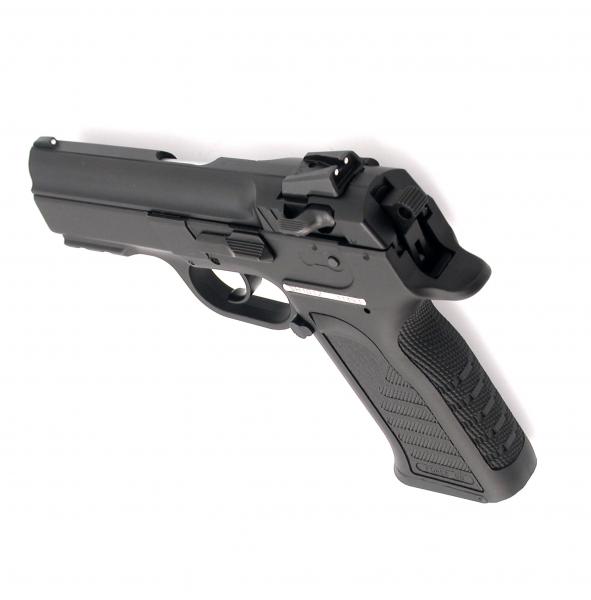 Pistola semiautomatica Tanfoglio Force Police R cal. 9X21, in doppia azione con fusto in tecnopolimeri con base picatinny per il montaggio rapido della torcia ad alta luminosità e/o del puntatore laser che è di estrema utilità per tutti coloro che operano nel campo della sicurezza armata. Questo modello è particolarmente adatto per le forze di polizia e la difesa professionale. Il modello Force Police viene prodotto sia nella versione R, che ha una sicura ambidestra manuale al percussore sul carrello che funge da leva abbatticane, con sicura automatica sul percussore.
