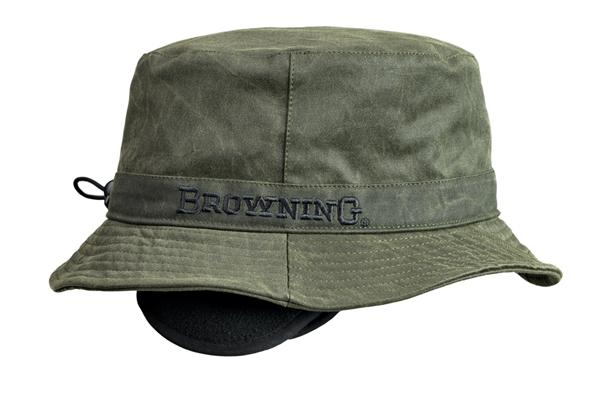 Cappello impermiabile della Browning  in tessuto cerato foderato in pile con comode copri orecchi per il massimo confoet. Disponibile in due colorazioni verde e marrone scuro.