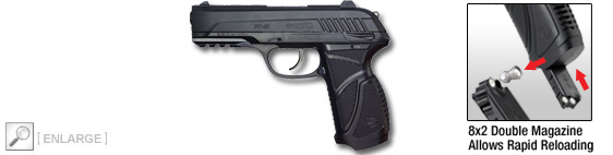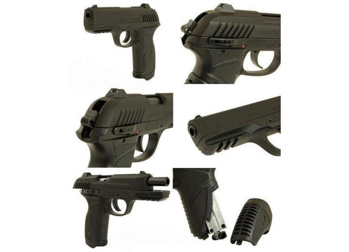 La Gamo PT-85 blowback è una pistola cal. 4,5 a CO2 scarrellante, che utilizza il sistema del caricatore a doppio tamburo da 8 colpi per lato, dotata di scatto del grilletto sia singola che doppia azione.