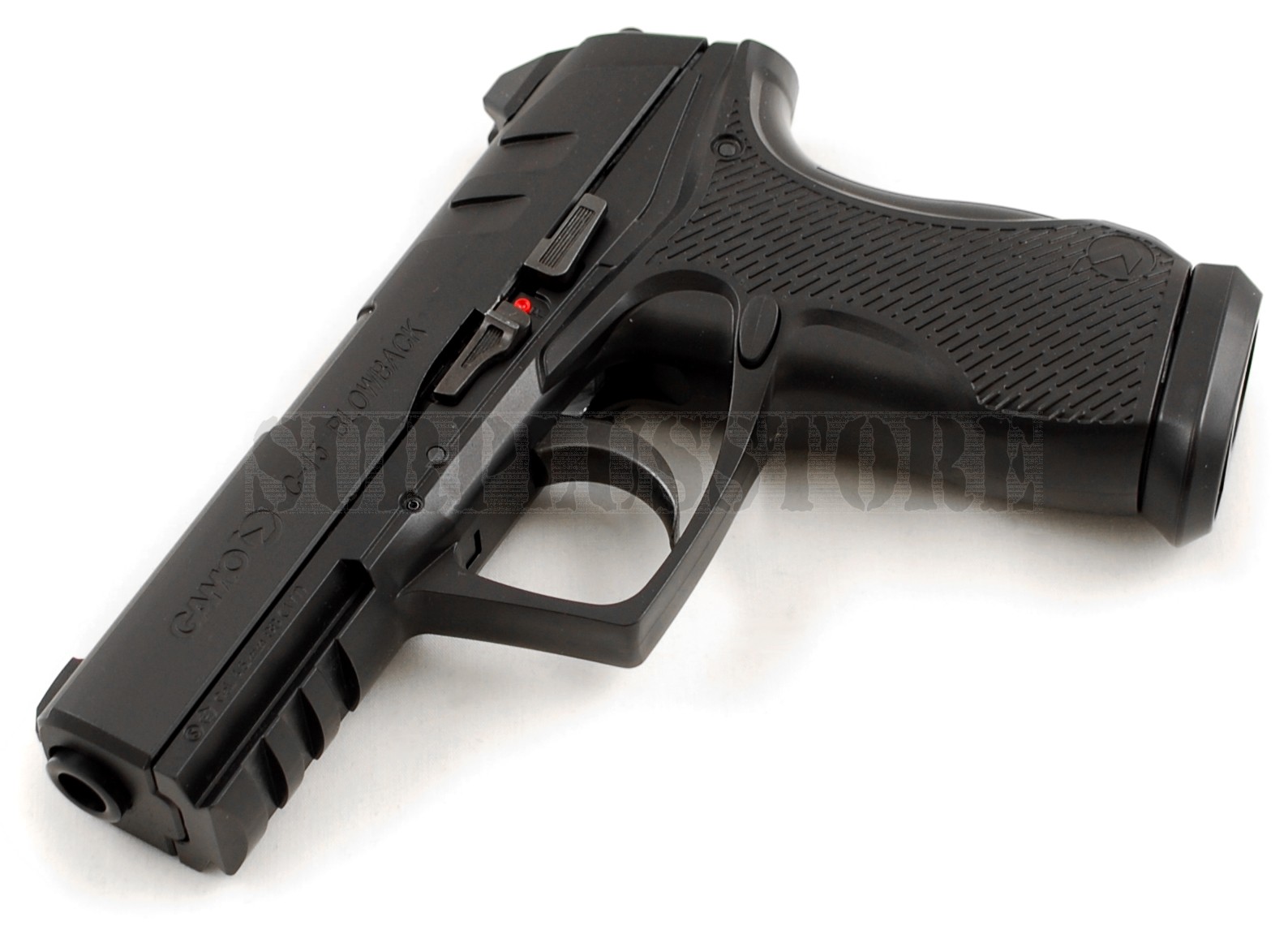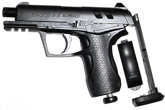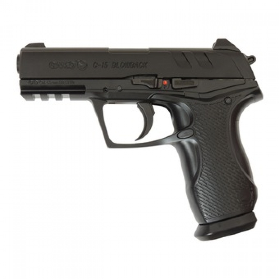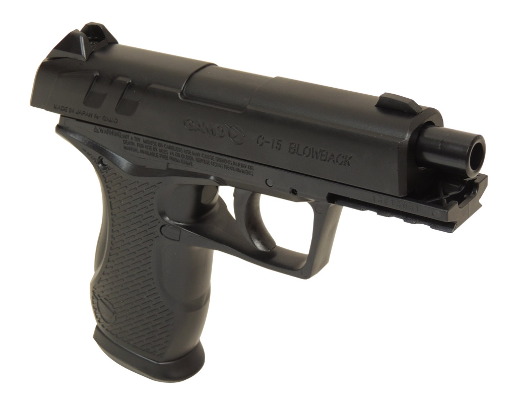 La Gamo C-15 blowback è una pistola cal. 4,5 a CO2 scarrellante, che utilizza un caricatore a pallimi sferici da 15 colpi per lato, dotata di sistema di scatto del grilletto a corsa lunga. Carrello in metallo, fusto in polimeri con slitta Picatinny sul dust cover.