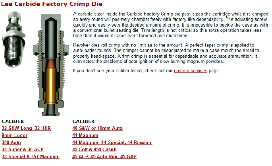 Il die Factory della Lee crimpa la palla nel miglior modo possibile rispetto a qualsiasi altro strumento. È impossibile deformare il bossolo come con i normali Roll Crimp Dies. Non è importante quanto il bossolo sia stato tornito. Test dimostrano che anche le palle che non hanno la corona di crimpaggio spareranno con maggior accuratezza se crimpate con il Factory Crimp Die della Lee.
