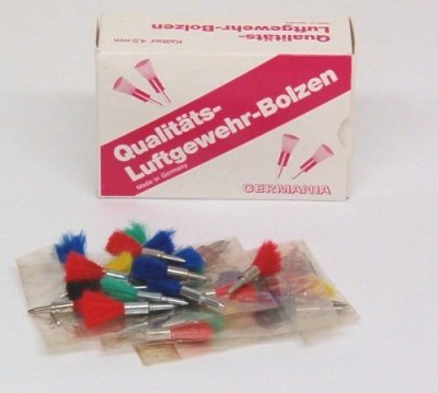 PIOMBINI PER CARABINA BOLZEN CON FIOCCO COLORATO CALIBRO 4,5mm PUNTA IN ACCIAIO CON FIOCCHETTO DI SETOLA COLORATO IMBALLAGGIO: BUSTE DA 25 PZ