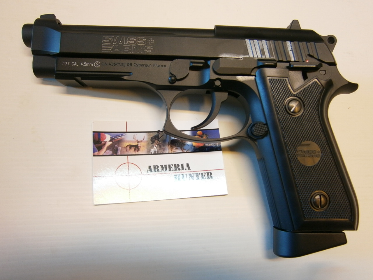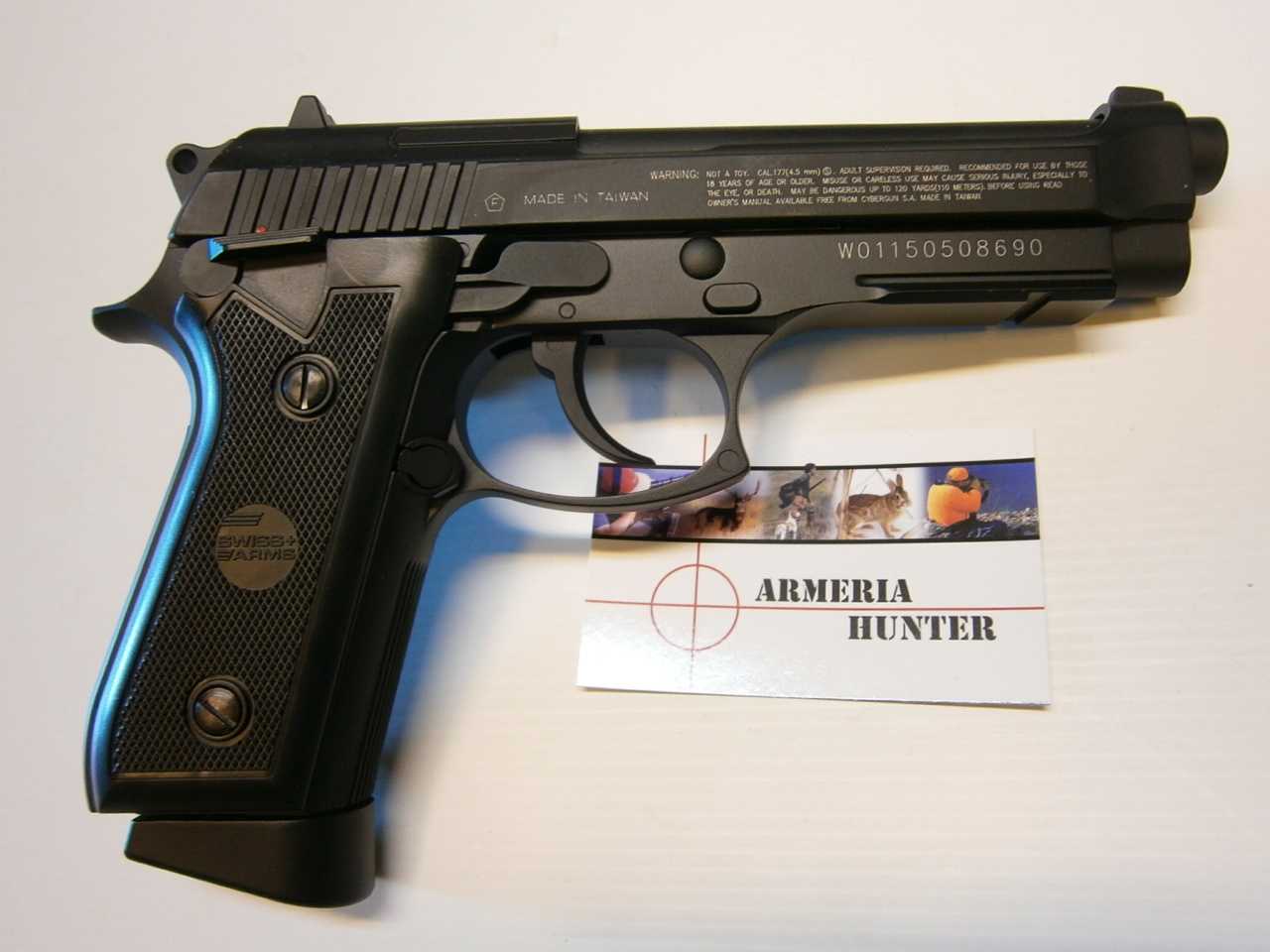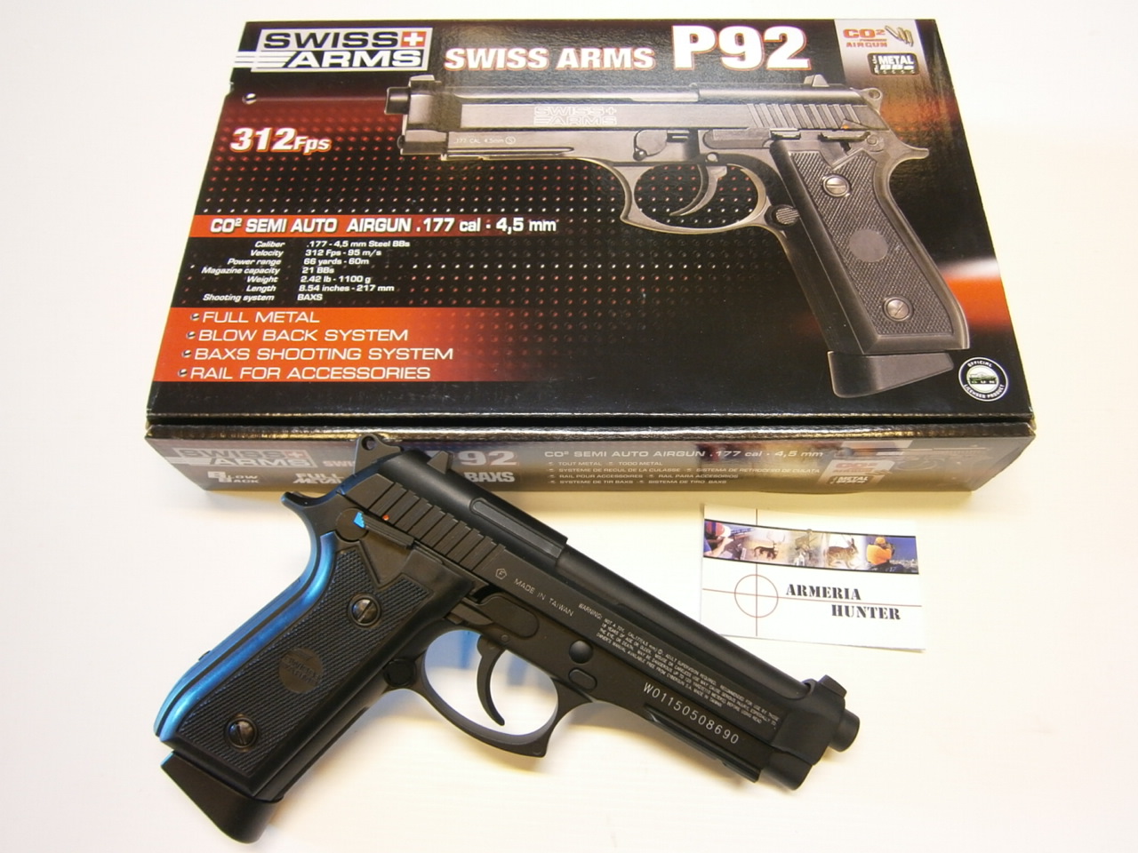 Pistola a Co2 SWISS ARM P92. Replica della Taurus PT 92 con sicura sul fusto. Full metal, scarrellante, velocità 95m/s, peso 1100 gr.