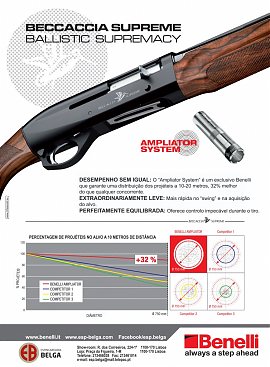 Il fucile semiautomatico Benelli Beccaccia Supreme è l’arma ideale per la caccia alla regina del bosco. Il nuovo ampliatore permette di ottenere tra i 10-20 metri rosate più ampie e guarnite (più del 32% della concorrenza). Un'arma che permette un'immediata acquisizione del bersaglio grazie alla velocità di brandeggio e inoltre il perfetto bilanciamento e la sua leggerezza garantiscono un'efficiente messa in mira. Calcioli in poliuretano per una perfetta anatomia alla spalla del cacciatore. La coccia e le incisioni della carcassa caratterizzano con forte personalità l'arma. I legni di noce rifiniti con il nuovo trattamento Elegance System rendono il fucile più resistente ai graffi e alle condizioni climatiche più estreme.